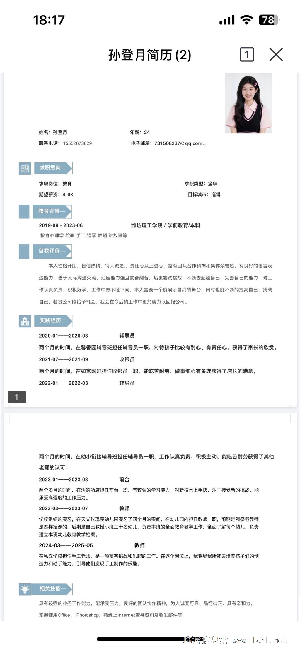 本人畢業兩年,畢業后在桓臺私立學校一年多,離職原因離家太遠住校,可以在臨淄長期工作,本人簡歷如下,期待和各位老板的合作!